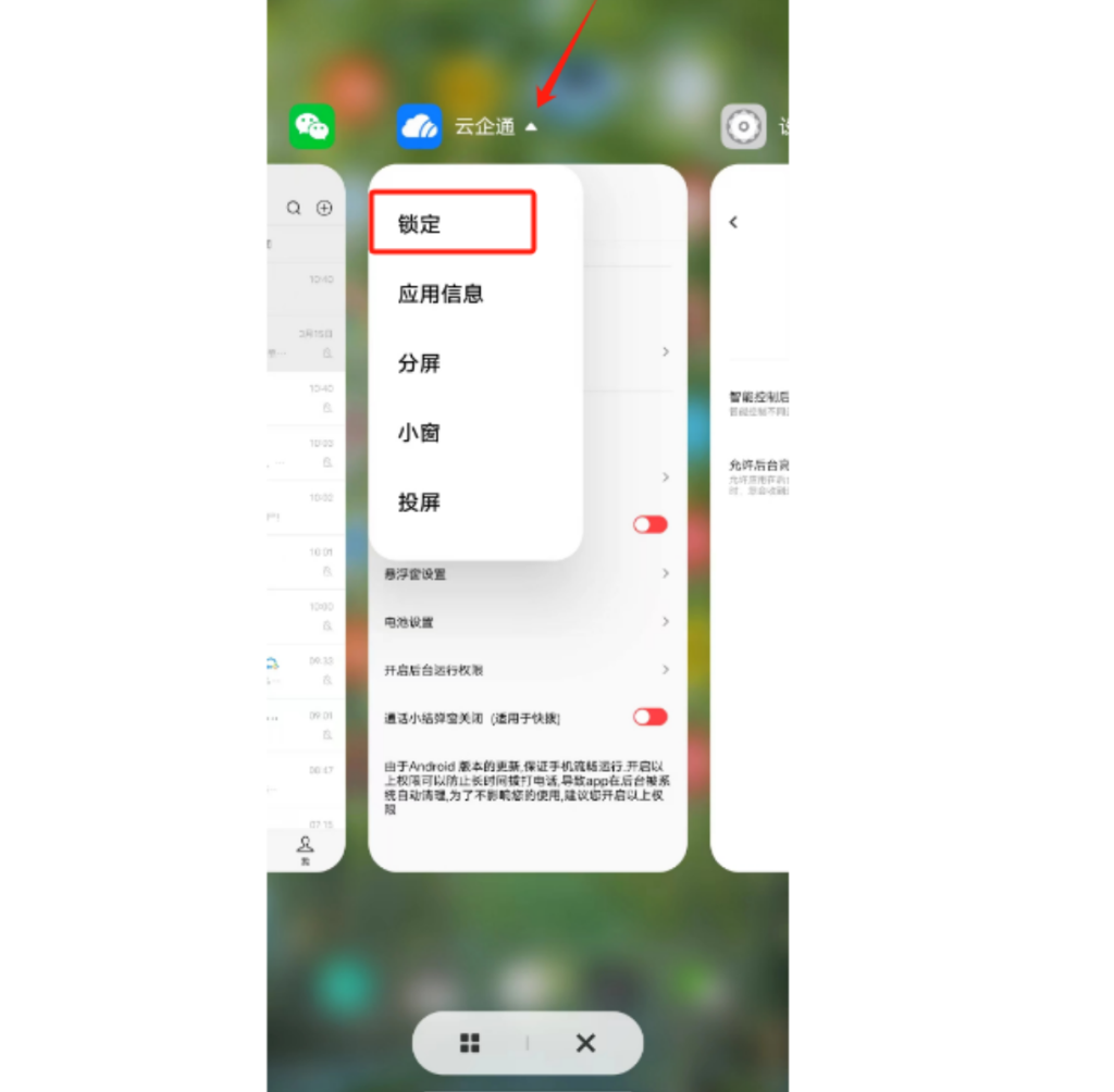 3、从手机底部上划至屏幕中间或者底部导航栏打开手机任务后台。锁定云企通后台运行保证不被手机清理